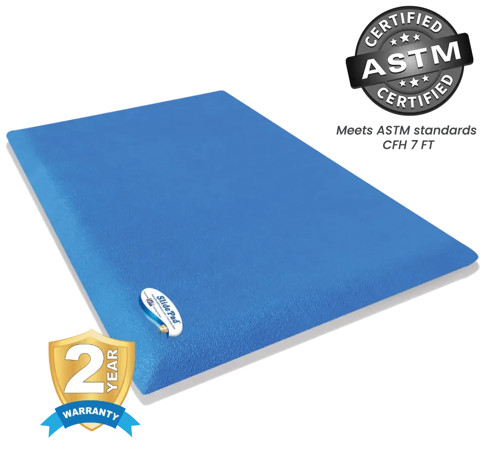 SlideRenu® has “re-engineered” the aquatic landing pad. We have eliminated the need to drill holes and install bolts. Our SlidePad® is glued down to the pool floor with a contact adhesive developed specifically to bond closed cell foam to a variety of hard underwater substrates. We have enhanced the safety aspects and softness of the landing surface by featuring a proprietary textured slip resistant EVA material and meets ASTM – 1292 critical fall height requirements up to 7’ and is UV and slip-resistant certified by a leading sports laboratory. The landing surface is covered under our comprehensive warranty against wear and tear.